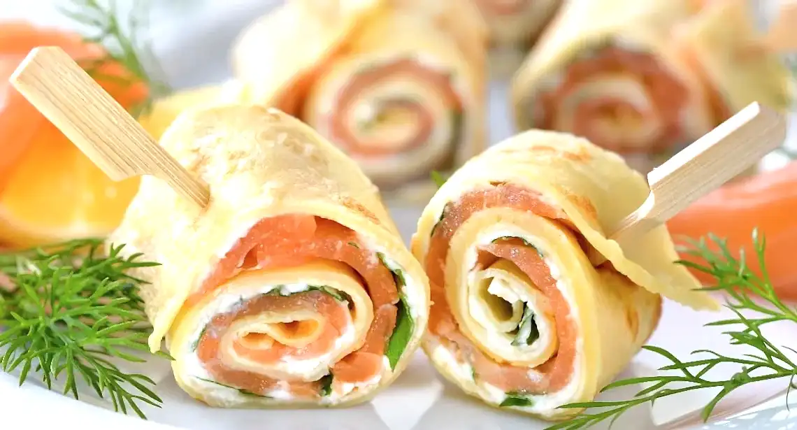 Рулетик из тонкого блинчика с семгой и сырным Pin Up